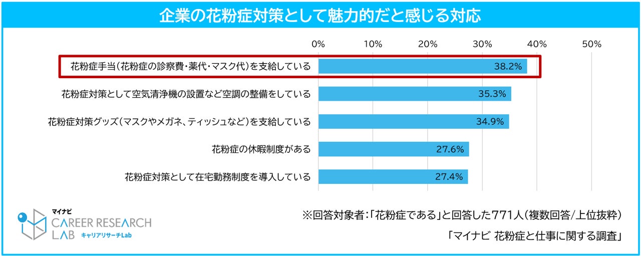 花粉症だと回答した人に対して、「企業の花粉症対策として魅力的だと感じる対応」について聞いた。その結果、最も魅力的だと感じる対応は「花粉症手当(花粉症の診察費・薬代・マスク代)の支給(38.2%)」であり、次いで「空気清浄機の設置など空調の整備(35.3%)」となった。【図7】