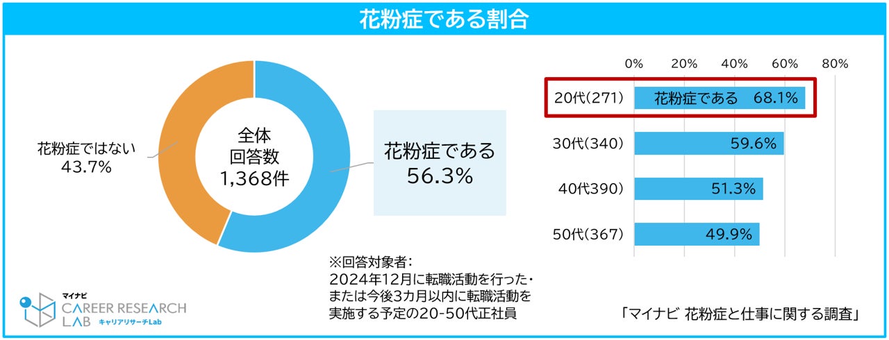 2024年12月に転職活動を行った、または今後3カ月以内に転職活動を実施する予定の20-50代正社員のうち、「花粉症である」と回答したのは56.3%だった。