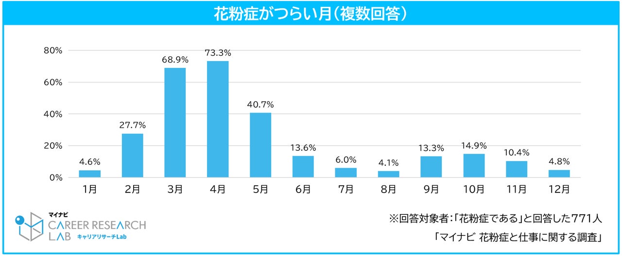 また、花粉症がつらい月を複数回答で聞いたところ、最も多かったのが4月で73.3%、次いで3月で68.9%だった。3月から4月が花粉症の症状が最もつらい時期であることがうかがえる。さらに、9月から11月にも小さなピークが見られ、秋にも花粉症の影響を受ける人が一定数いることがわかる。【図2】