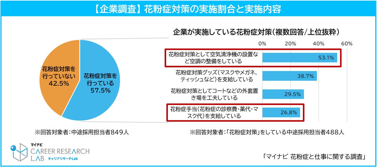 また、企業に対して花粉症対策を実施しているかを聞いたところ、実施している割合は57.5%だった。