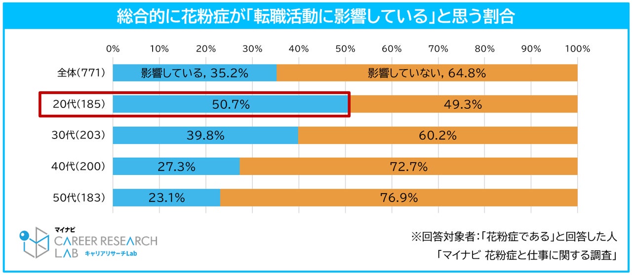自身が「花粉症である」と答えた人のうち、「花粉症が転職活動に影響している」と感じている人は35.2%となった。年代別に見ると、20代は50.7%となり、花粉症の転職への影響は年代が低いほど高い傾向にある。【図3】