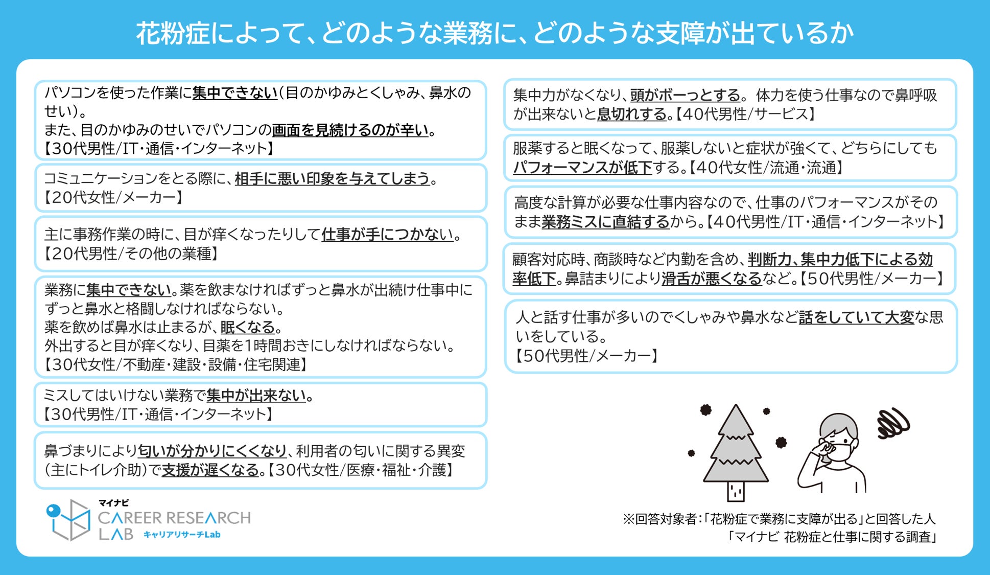 「花粉症が業務に与える具体的な影響」を自由回答で聞くと、「パソコンを使った作業に集中できない。また、目のかゆみのせいでパソコンの画面を見続けるのがつらい」など、デスクワークにおける集中力の低下を挙げるものが多数見られた。 また、「コミュニケーションをとる際に、相手に悪い印象を与えてしまう」など、花粉症の症状が対人関係に悪影響を及ぼすという回答も見られた。