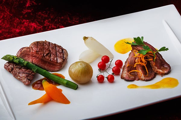 牛フィレ肉のグリル オニオンソース と 鴨肉のロースト オレンジソース