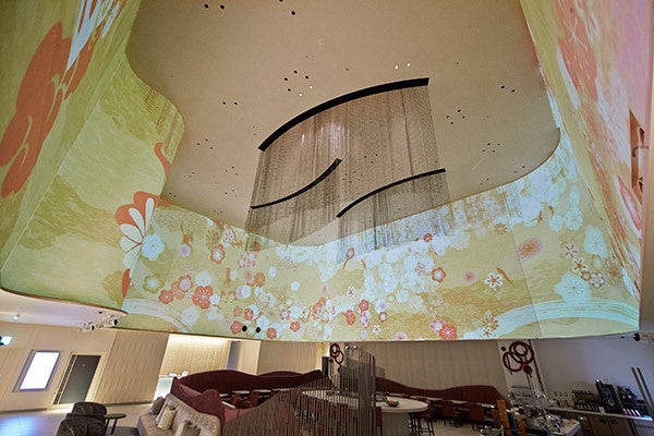 エレベーターの扉が開くと、目に映るのは吹き抜け一面に広がるプロジェクションマッピングの空間。