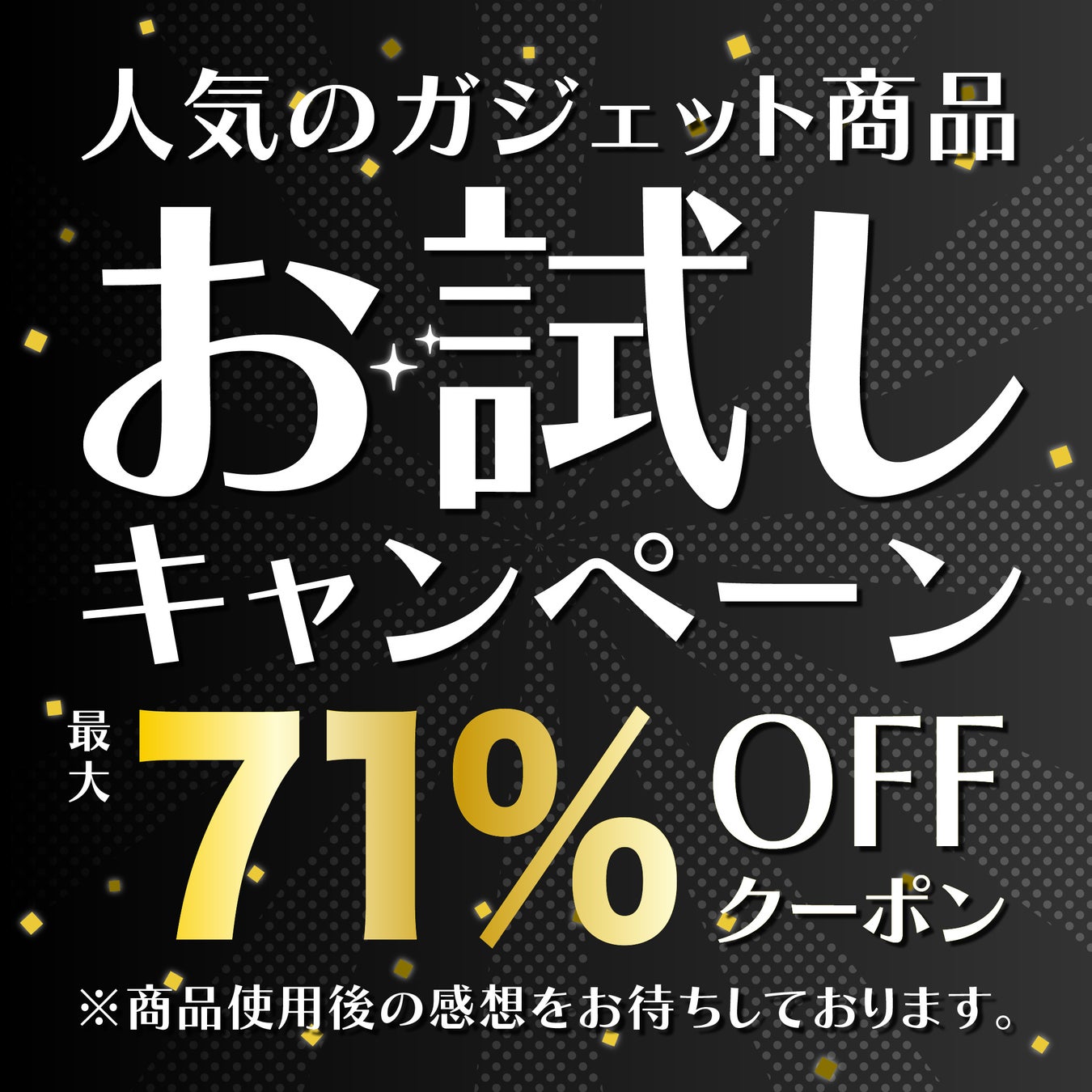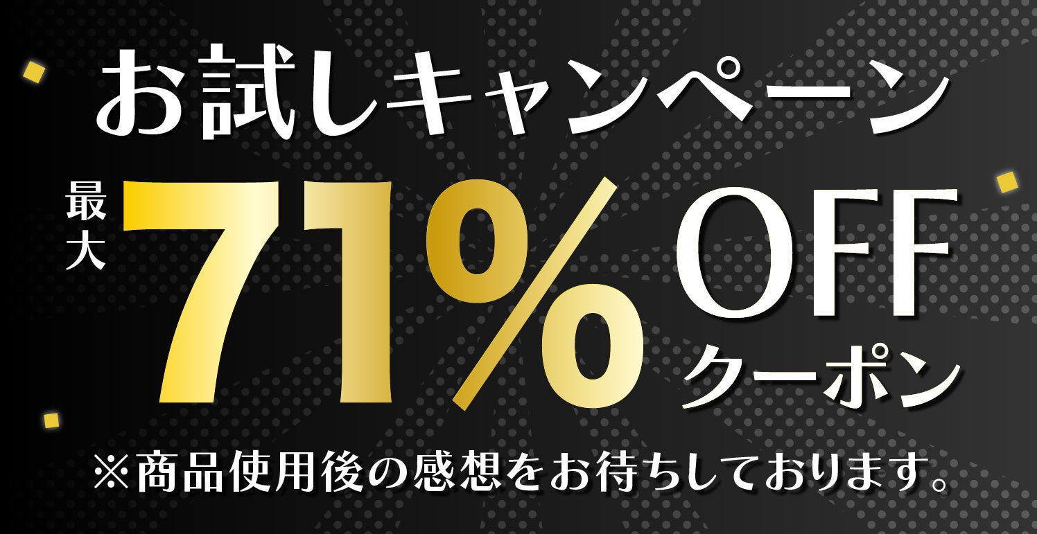 条件・期間 | 9/30 23:59まで ※商品使用後は感想を是非お待ちしております。 ※なくなり次第終了 ※「先着30名限定 50%OFFクーポン」は他クーポンとの併用不可 |