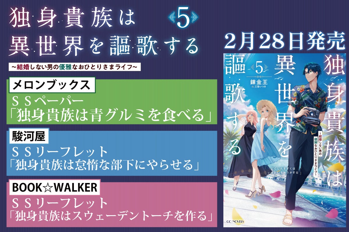 常夏の海国で最高の休日を!GCノベルズ『独身貴族は異世界を謳歌する~結婚しない男の優雅なおひとりさまライフ~ 5』2月28日発売!