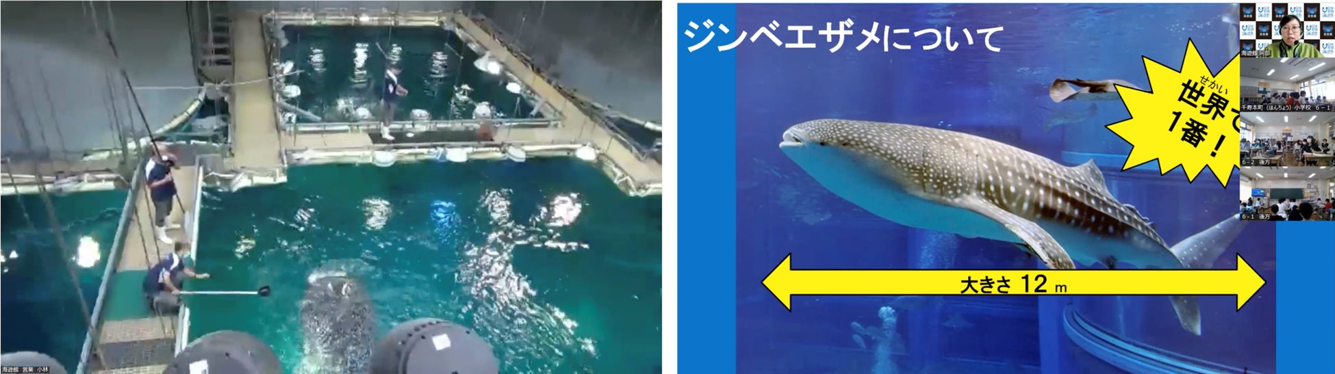 授業を担当した海遊館は、海の生きものたちの様子を海遊館での飼育の様子を交えながら解説しました。謎解きパートの授業内容を踏まえて海洋問題についてのより詳しい解説を行い、実際に海遊館で飼育・展示しているジンベエザメをテーマにしたリアルな海の問題や生きものの生態について貴重な資料を交えながら紹介しました。途中、海遊館の大水槽からリアルタイムで中継を行い、ジンベエザメの給餌の様子を見学。大量の海水を取り入れて餌をこしとるジンベエザメだからこそ、より深刻な問題となってしまう「マイクロプラスチックの誤飲」といった問題を深堀りしました。ジンベエザメについての解説中には、子供たちに実際に教室でジンベエザメの長さを測ってもらい、その大きさを実感してもらいました。