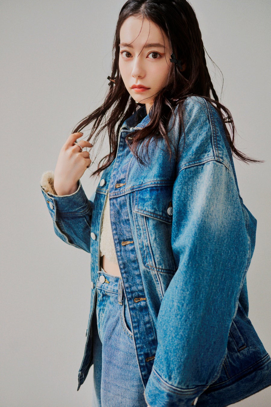 ジャケットと同色のデニムパンツを合わせ、セットアップ風に。ポイントでリボンやブラウンのバッグをプラスして抜け感を意識しました。