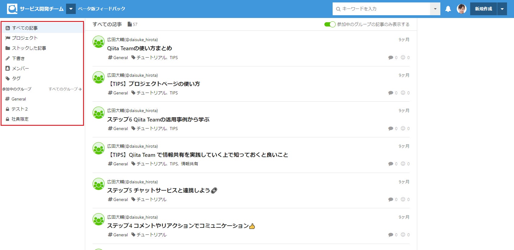 また、「プロジェクト」「ストックした記事」「下書き」「メンバー」「タグ」などのカテゴリも全て左サイドバーに集約して導線をまとめることで、記事の検索や閲覧、投稿をよりシームレスに行うことが可能となります。
