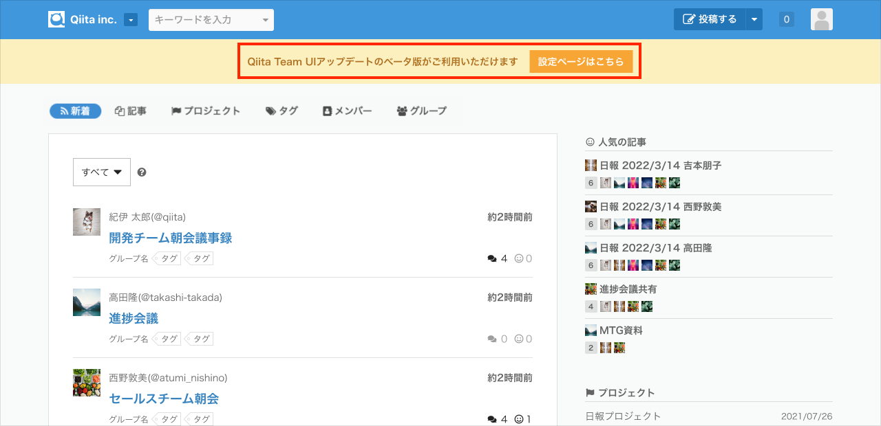 ベータ版への切り替えは「Qiita Team」にログインいただき、ヘッダー下のテキストリンク「設定ページはこちら」をクリックしていただくことで新UIへ切り替わります。なお、ベータ版と通常版の切り替えはいつでも行えます。また、切り替えはユーザーごとに設定可能です。