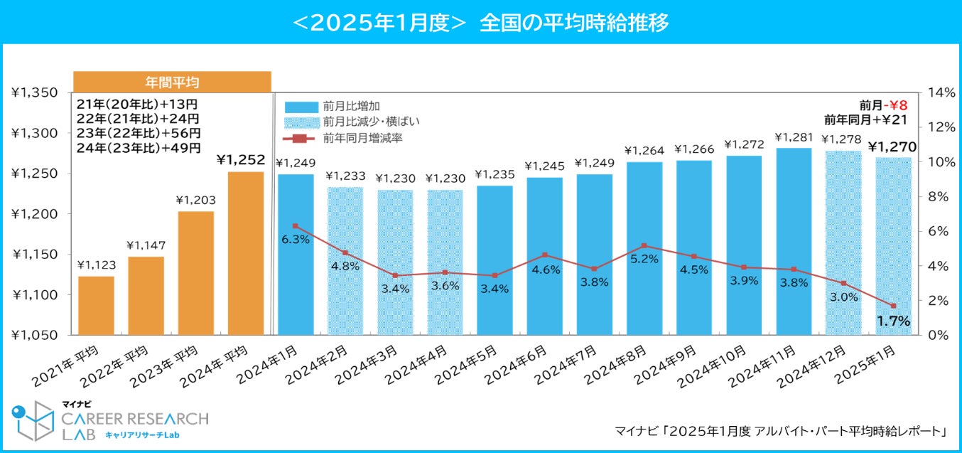 2025年1月の全国平均時給は1,270円(前月比8円減、前年同月比21円増)と2カ月連続で前月比が減少した。