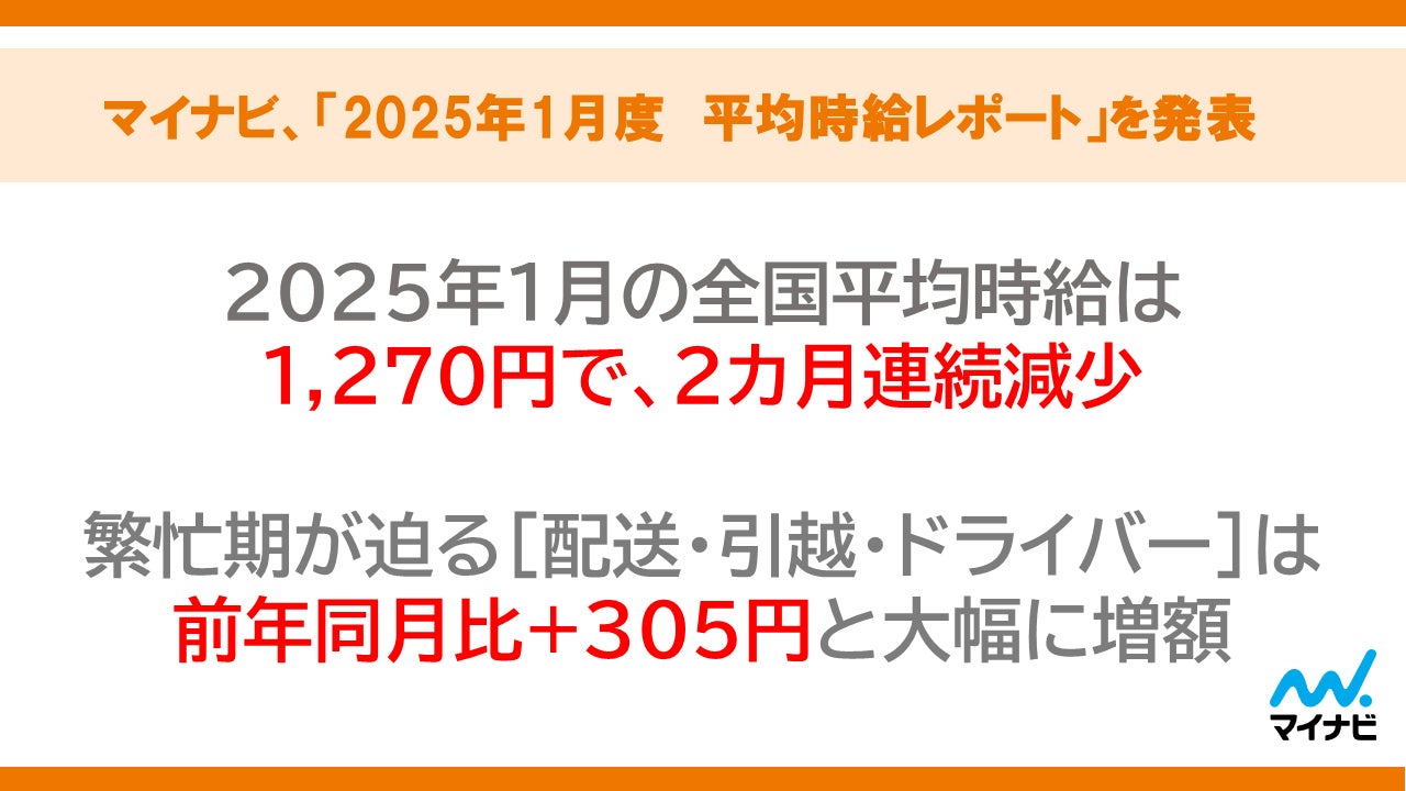 株式会社マイナビ(本社:東京都千代田区、代表取締役 社長執行役員:土屋芳明)は、アルバイト平均時給レポート(2025年1月度)を発表しました。本調査は、アルバイト・パート求人情報サイト『マイナビバイト』(https://baito.mynavi.jp/)に掲載された求人広告データを集計したものです。