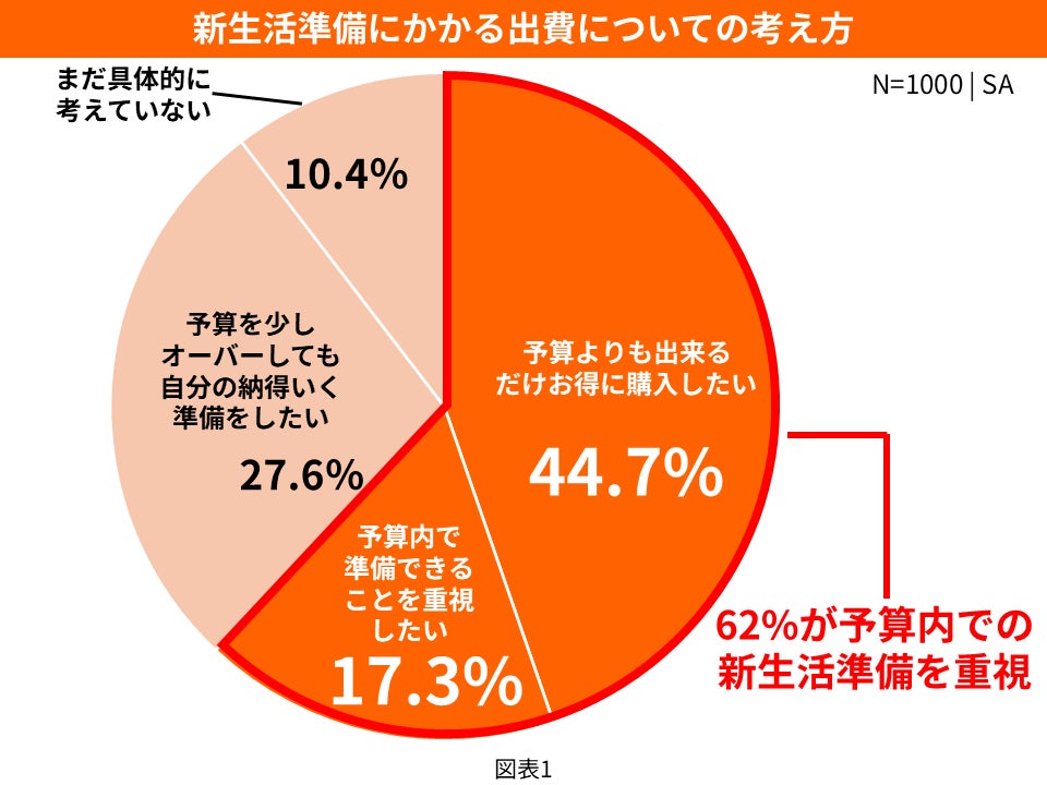 新生活準備にかかる出費についての考えを聞いたところ、「予算よりも出来るだけお得に購入したい」「予算内で準備できることを重視したい」と回答した人は、全体の約6割にのぼりました。【図表1】