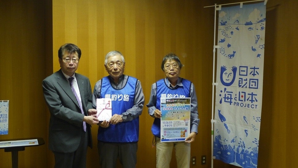 寄付金は、10月12日(木)に「一般社団法人 海と日本プロジェクトinやまぐち」を通じて、長年瀬戸内海の海洋環境保全に取り組んでいる「山口県釣り団体協議会」に贈呈されました。一般社団法人 海と日本プロジェクトinやまぐちを代表して久保和成事務局長から、山口県釣り団体協議会の福谷康男副会長と柳原好宏事務局長へ手渡されました。福谷副会長は「贈呈をいただき、本当にありがとうございます。2007年から年間5回程度、海岸や埠頭、海底の清掃をしておりますが、メンバーの高齢化もあり、ここ最近は幼稚園児や児童、生徒、学生、企業の方たちと一緒に清掃活動をしています。これまでに延べ1万人以上の参加者と一緒に、200トン以上の海洋ごみを集めてきました。活動を始めたころに比べ、海もかなりきれいになった印象はありますが、活動を止めるとまた元に戻ってしまうと思います。これからも若い世代と一緒になって活動を続けていきたいです。」と話していました。また、柳原事務局長は「綺麗に見える海も、海底にはレジ袋などが堆積しています。これを放置するとやがて分解されマイクロプラスチックとなります。2050年には海洋ごみが魚の量を上回ると言われておりますが、そうならないように私たちは子供たちに海の問題をこれからも教えていきたいと思います。」と語ってくれました。「一般社団法人 海と日本プロジェクトinやまぐち」も、同会と一緒にふるさとの海を守る活動を続けて参ります。