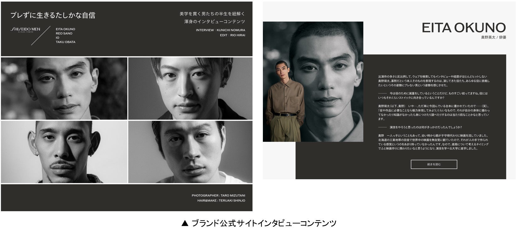 ブランド公式サイトでは、マルチクリエイターの野村訓市氏がインタビュアーとして制作に携わった、出演者のスペシャルインタビューを掲載。一人ひとりの「ブレない生き様」にフォーカスを当てたインタビューは、今まで明かされなかった深いストーリーや、それぞれの人生の美学を知ることができる魅力的なコンテンツとなっています。また、デジタル広告では、インタビューを通して紡ぎ出された、彼らの「ブレない自信」を表現するメッセージを取り入れることで、本質的な男の美学を表現しています。