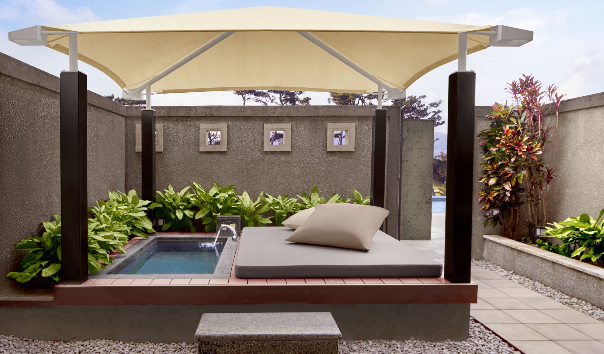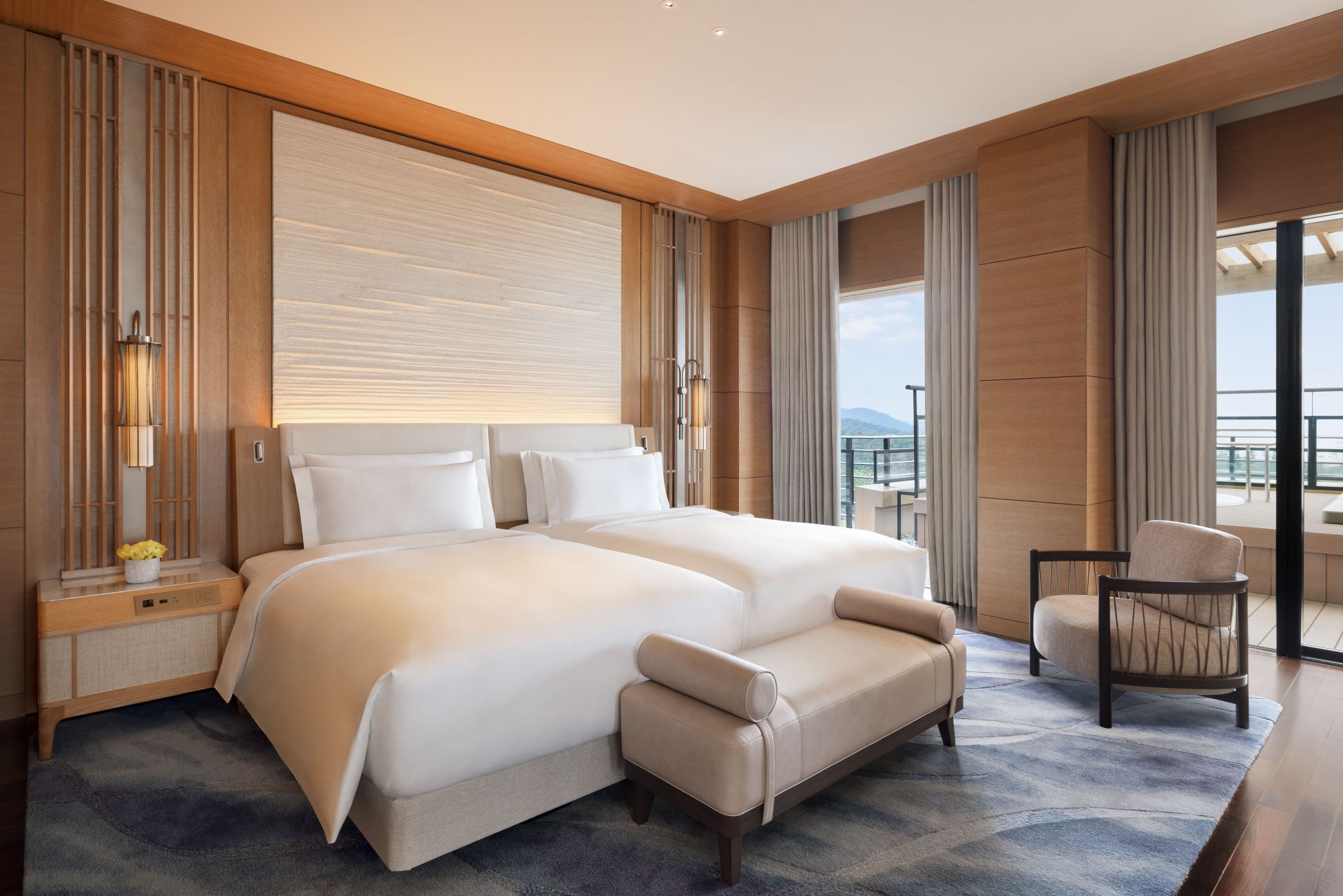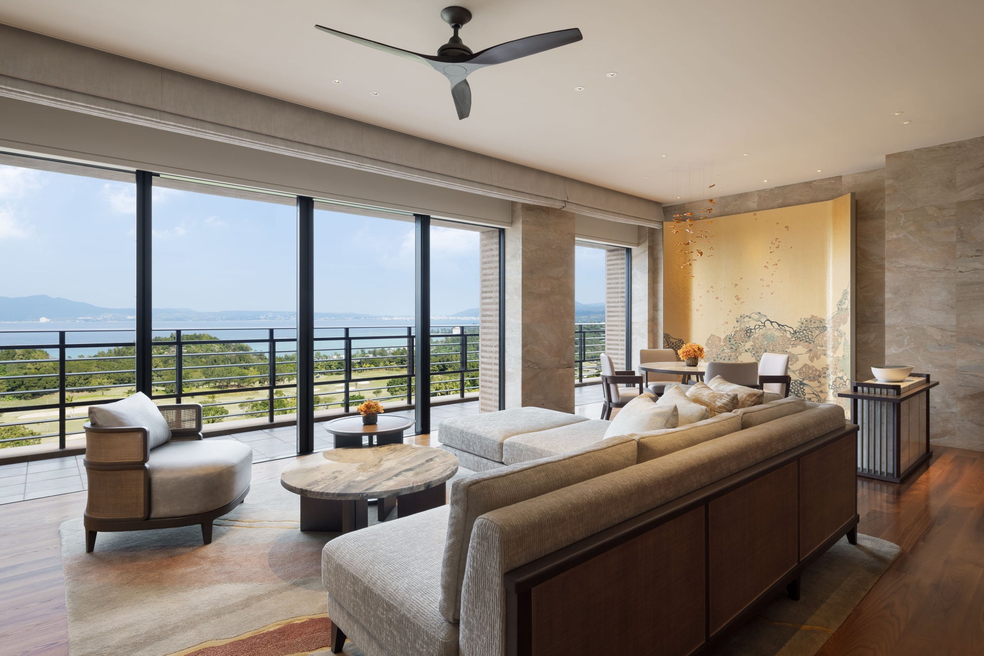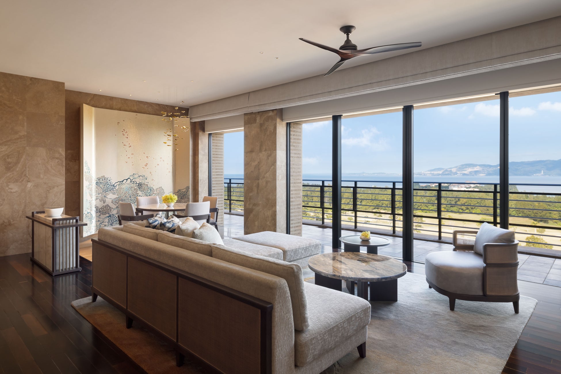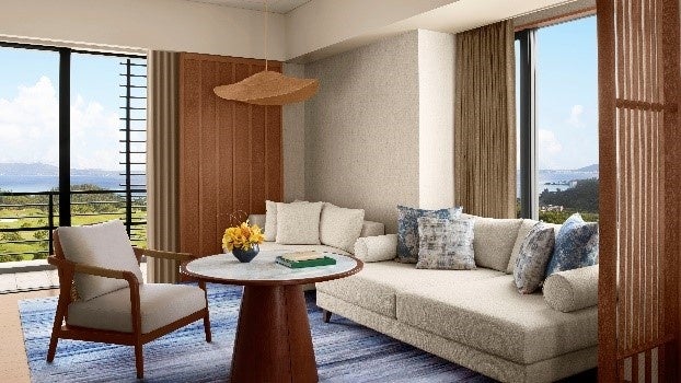 新しい客室のデザインには、琉球漆喰や琉球藍といった伝統技術や染料を取り入れ、「やんばるグリーン」や「名護ブルー」を基調とした優しい風合いが特徴です。さらに、2室限定のスイートルームは、デザインコンセプト「黄金御殿 – くがにうどぅん -」*を軸に、東側に位置するプレジデンシャルスイートは太陽をモチーフに、西側のリッツ・カールトンスイートは月をモチーフにした空間が広がります。