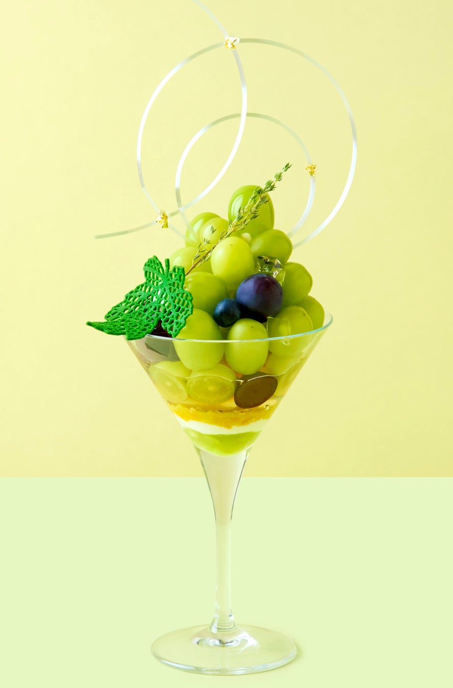 みずみずしい果実が織りなすグラデーションは、まるで一房の葡萄がそのままグラスに咲いたかのよう。トップにはマスカットの蔦をイメージした飴細工が優雅な弧を描き、巨峰のシャーベットや特製シャインマスカットジャム、柑橘と紅茶のジュレが層を成し、爽やかで奥行きのある味わいを演出します。