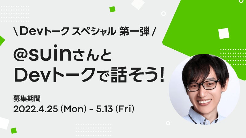 スペシャル企画として、「Qiita」で活躍するトップコントリビューターであるsuin氏とDevトークを、本日4月25日(月)より募集開始いたします。