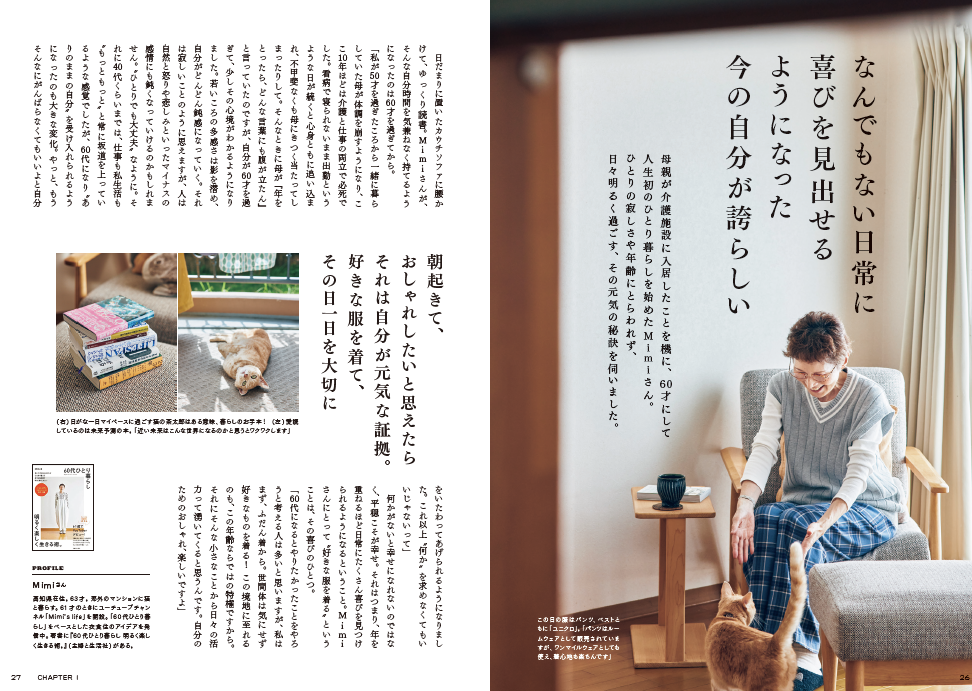 Mimiさん…高知県在住。63才。郊外のマンションに猫と暮らす。61才のときにユーチューブチャンネル「Mimi’s life」を開設。「60 代ひとり暮らし」をベースとした衣食住のアイデアを発信中。『60代ひとり暮らし明るく楽しく生きる術。』(主婦と生活社)がヒット中。