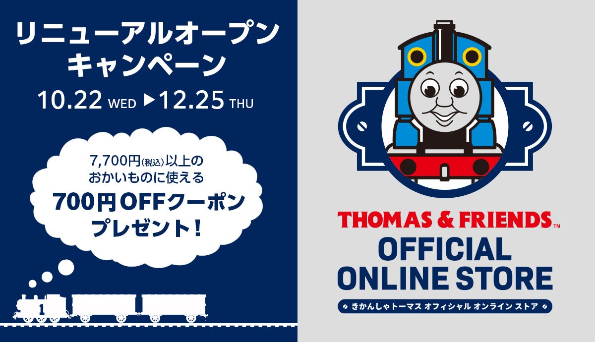 「きかんしゃトーマス公式オンラインストア」では、リニューアルを記念してお買い物にすぐにご利用いただける700円OFFクーポンを配布中です。この機会にぜひオンラインストアにてお買い物をお楽しみください。
