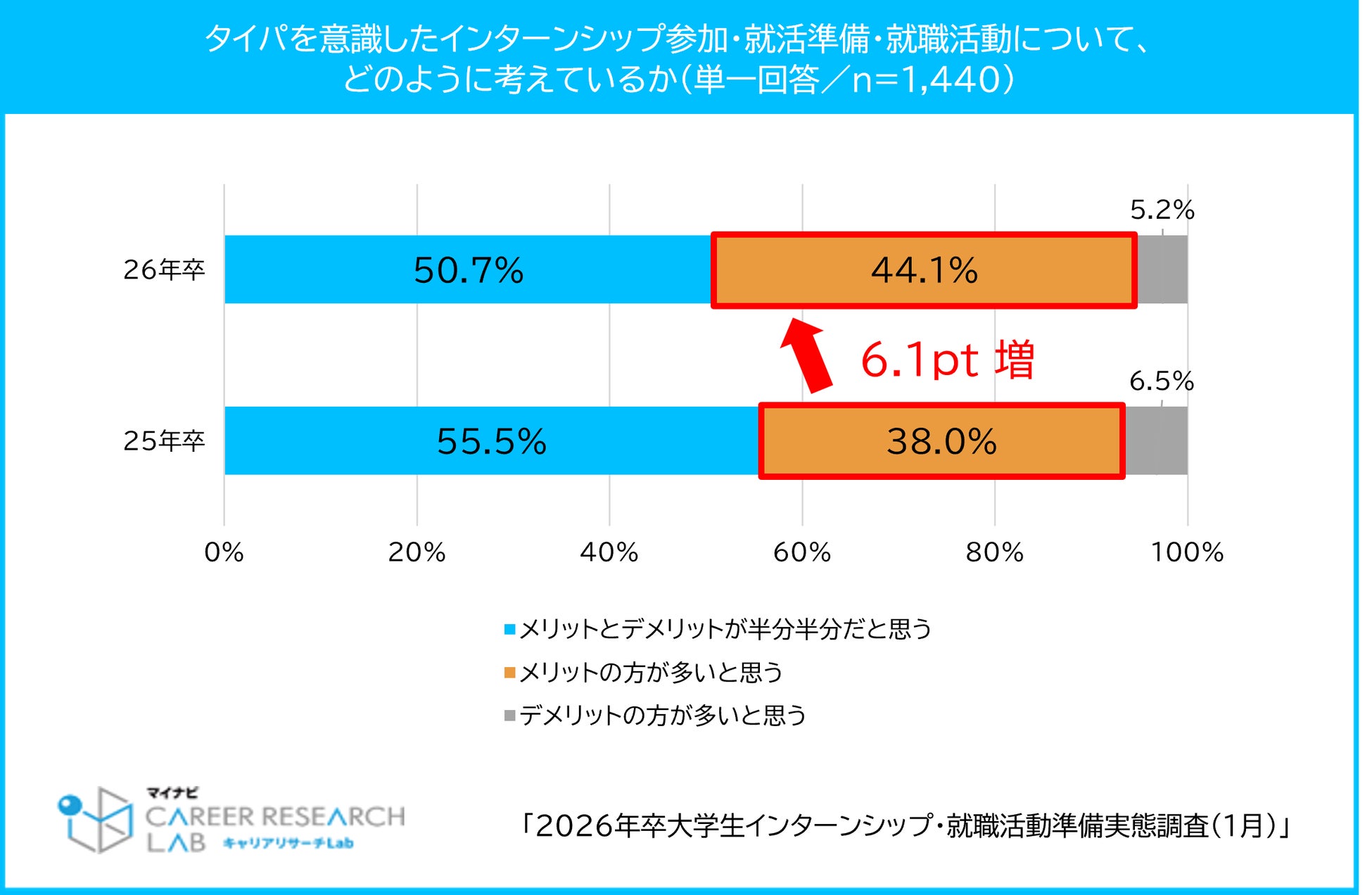 「タイパ(タイムパフォーマンス)」を意識したインターンシップ・就活準備・就職活動について、どのように考えているかを聞いたところ、「メリットとデメリットが半々だと思う」と回答した学生は50.7%で最多となった。「メリットが多いと思う」と回答した学生は44.1%で、前年の38.0%から6.1pt増加した。【図6】