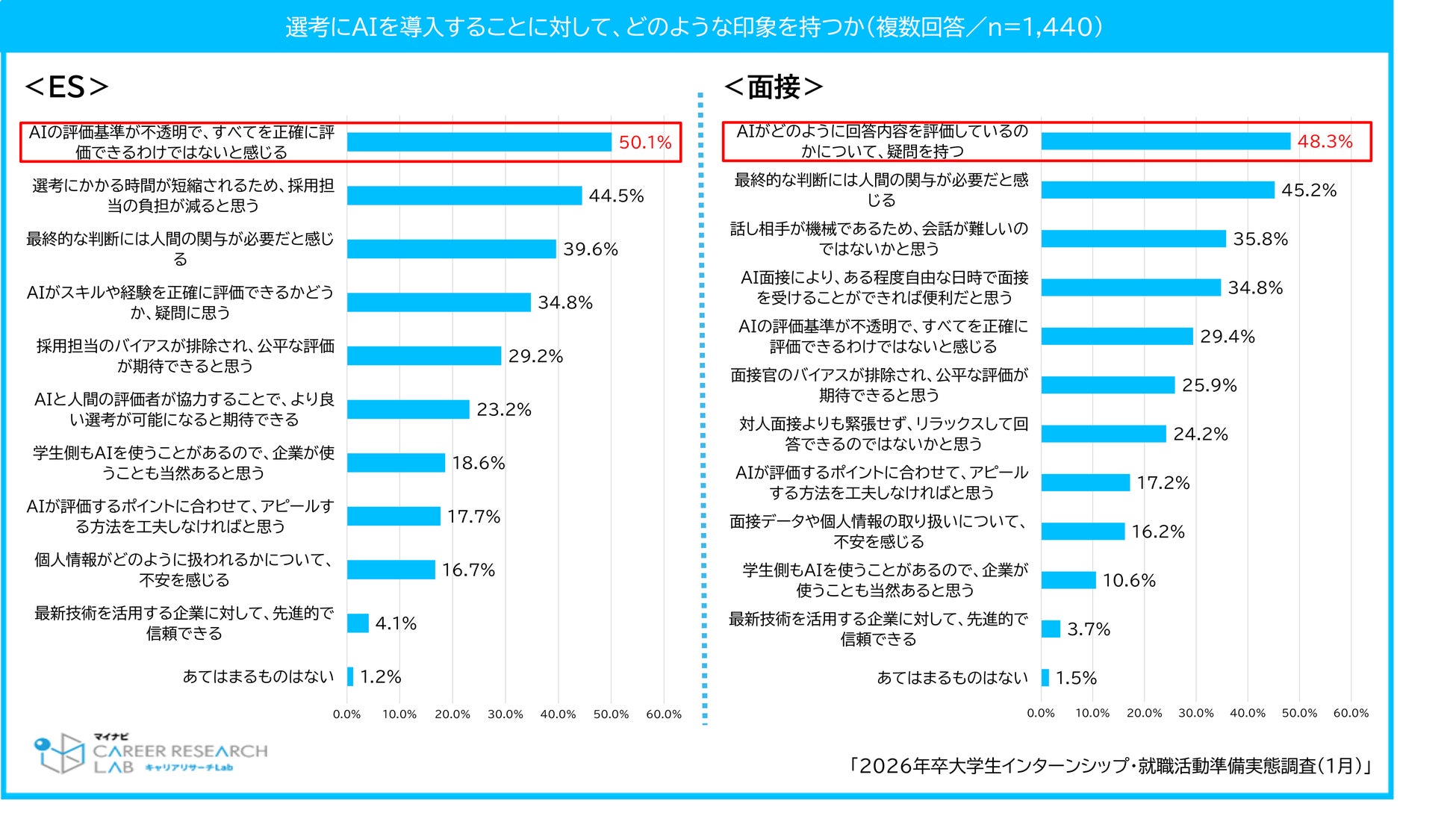 エントリーシート(ES)の選考に企業がAIを導入することに対して、どのような印象を持つか聞いたところ、50.1%が「AIの評価基準が不透明で、すべてを正確に評価できるわけではないと感じる」と回答した。