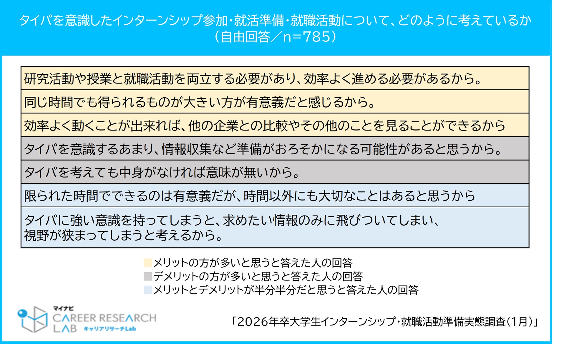 同質問の自由回答では、「タイパを意識するあまり、情報収集など準備がおろそかになる可能性がある」というデメリットを危惧する意見がある一方で、「研究活動や授業と就職活動を両立する必要があり、効率よく進める必要がある。」「効率よく動くことが出来れば、他の企業との比較やその他のことを見ることができるから」など、効率を重要視する声もあがった。【図7】