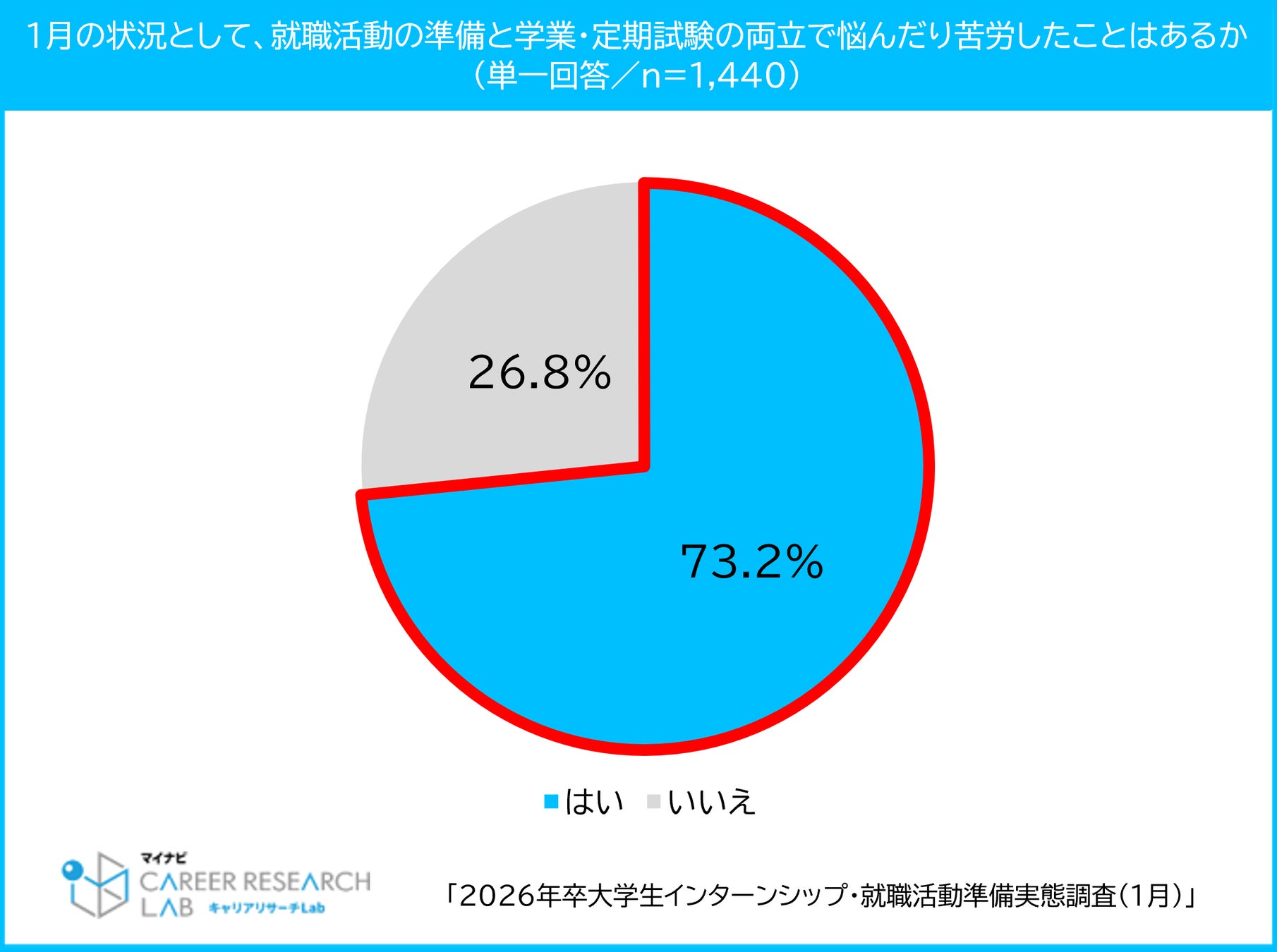 ◆73.2%の学生が1月にインターンシップ・仕事体験への参加や就職活動準備と、学業・定期試験の両立で悩んだり苦労したと回答