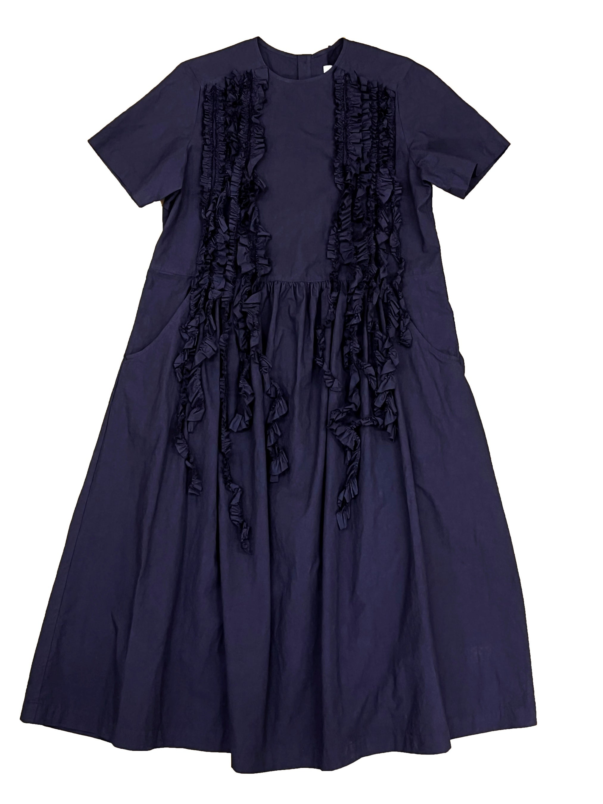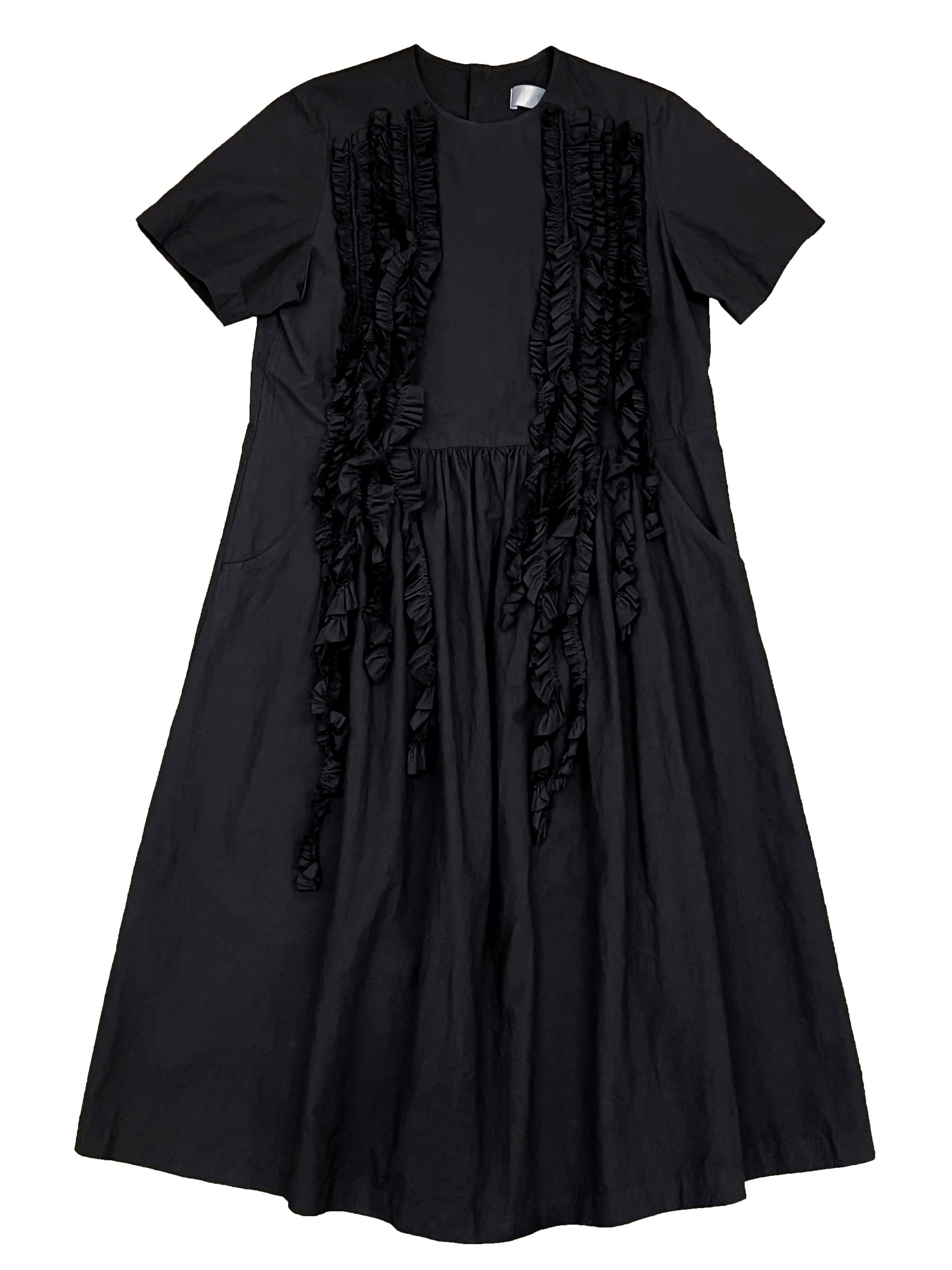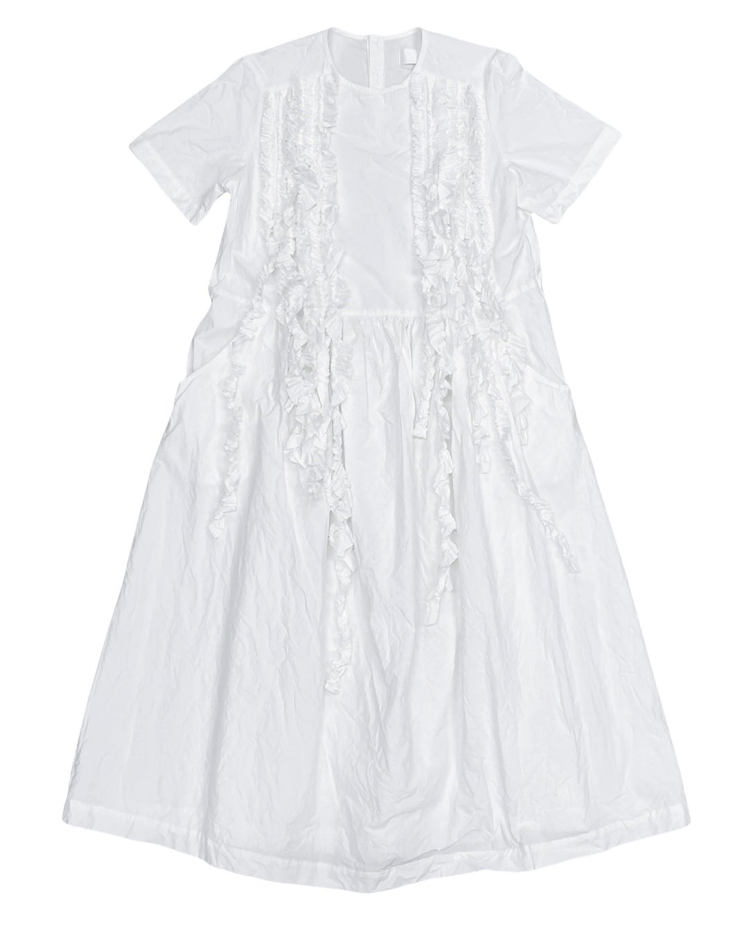 シンプルなウエスト切り替えの半袖ワンピースをベースに、左右に長く垂れ下がった数本のフリル状のテープで装飾を施しました。夏に一枚でさらっと着ていただくだけで存在感があり、今シーズンのtaoのコレクションテーマの雰囲気を漂わせたデザインが特徴です。