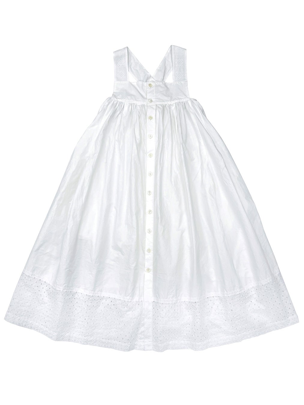 肩ストラップ部分に花柄刺繍のブレードを使い、後ろ姿にもポイントある前ボタンのジャンパースカート。胸元のギャザーでAラインに広がり、裾部分は格子柄のレースで切り替えられており軽やかな印象です。