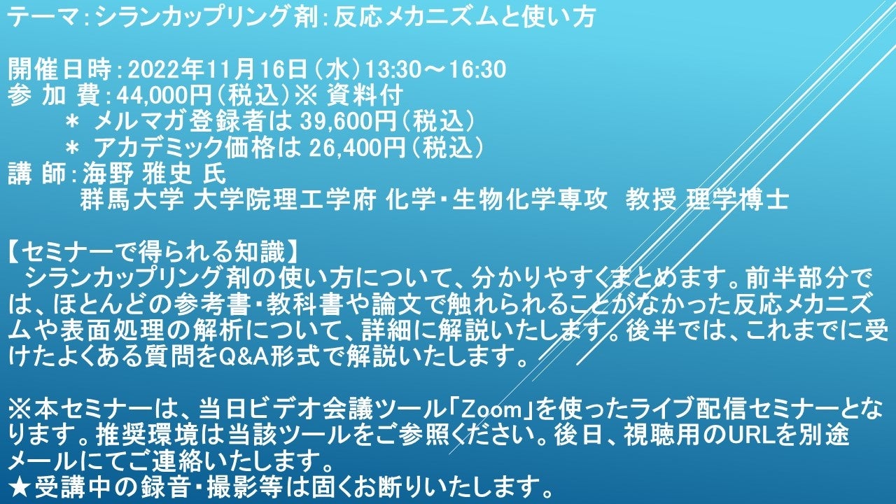 先端技術情報や市場情報を提供している(株)シーエムシー・リサーチ(千代田区神田錦町: https://cmcre.com/ )では、 各種材料・化学品などの市場動向・技術動向のセミナーや書籍発行を行っておりますが、 このたび「シランカップリング剤:反応メカニズムと使い方」と題するセミナーを、 講師に海野 雅史 氏 群馬大学 大学院理工学府 化学・生物化学専攻 教授 理学博士)をお迎えし、2022年11月16日(水)13:30より、 ZOOMを利用したライブ配信で開催いたします。 受講料は、 一般:44,000 円(税込)、 弊社メルマガ会員:39,600 円 (税込)、 アカデミック価格は26,400 円 (税込)となっております(資料付)。