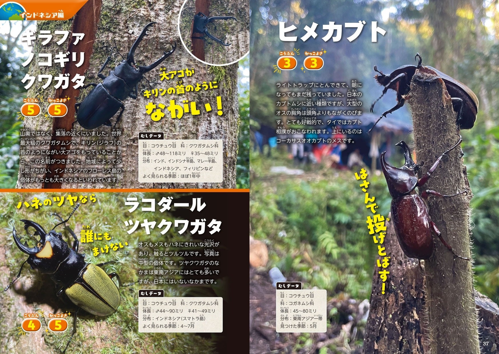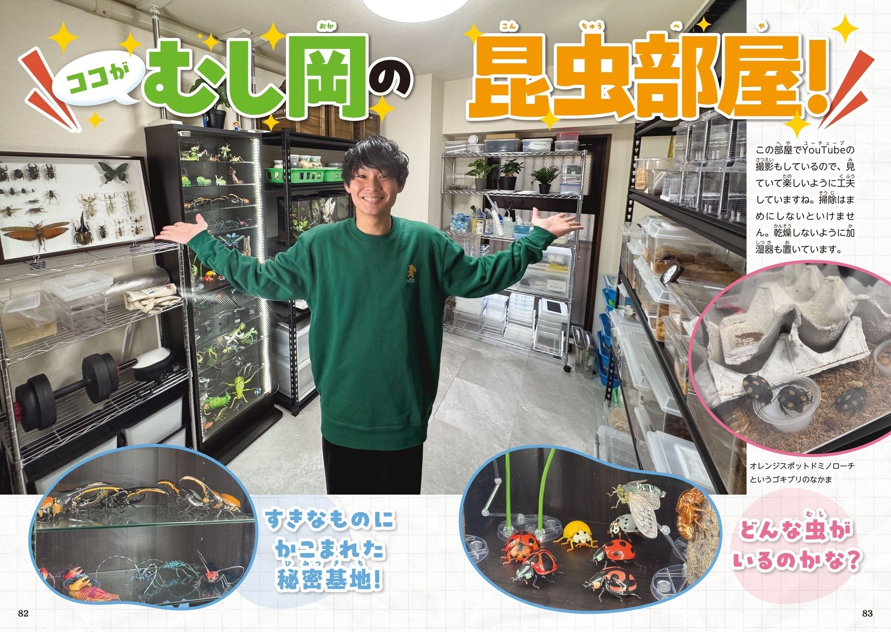 子どもたちをくぎ付けにするビジュアルと、「どこで見つけた?」「どんな虫?」といった好奇心にむし岡がこたえる構成で、読むとますます昆虫や自然が好きになる一冊です。