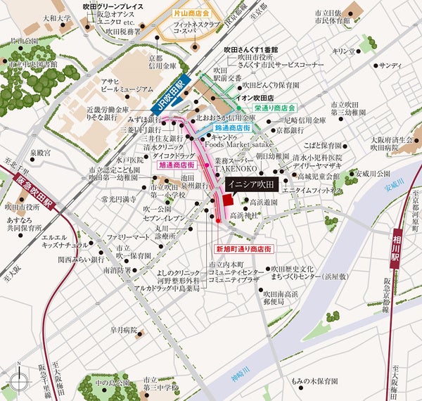 交通:東海道線「吹田」駅中央出口徒歩6分、阪急千里線「吹田」駅東口徒歩12分、阪急京都線「相川」駅西口徒歩11分