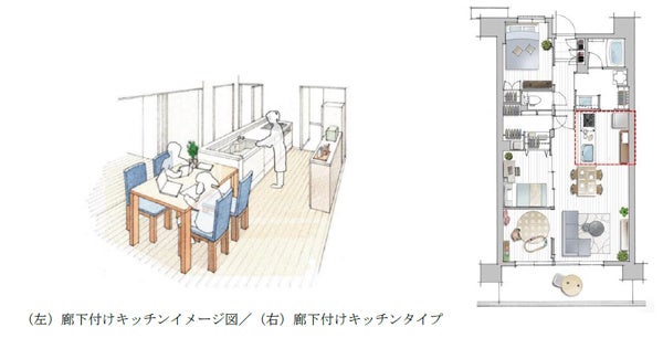 ►「廊下付けキッチンタイプ」:暮らしやすい水廻り動線を確保。ライフステージに合わせ間取り変更ができるタイプ。キッチンからランドリールーム、リビングまでスマートに行き来できる家事動線が特徴。
