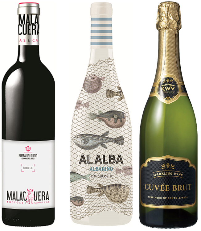 ボデーガス・マラクエラ/マラクエラ・ロブレ 赤:スペイン/リベラ・デル・ドゥエロ 2,653円、マーティン・コダック/アル・アルバ・ブランコ 白:スペイン/リアス・バイシャス 2,475円、KWV/キュヴェ・ブリュット 泡白:南アフリカ/ウエスタンケープ 1,358円