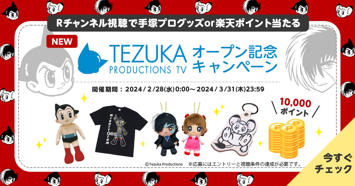 ・キャンペーン内容: 期間中、エントリーのうえ、アプリ内で楽天IDログイン後に「手塚プロダクションTV」を5分以上視聴した方を対象に、抽選で「手塚治虫グッズ」や「楽天ポイント」10,000ポイントを合計12名に進呈します。