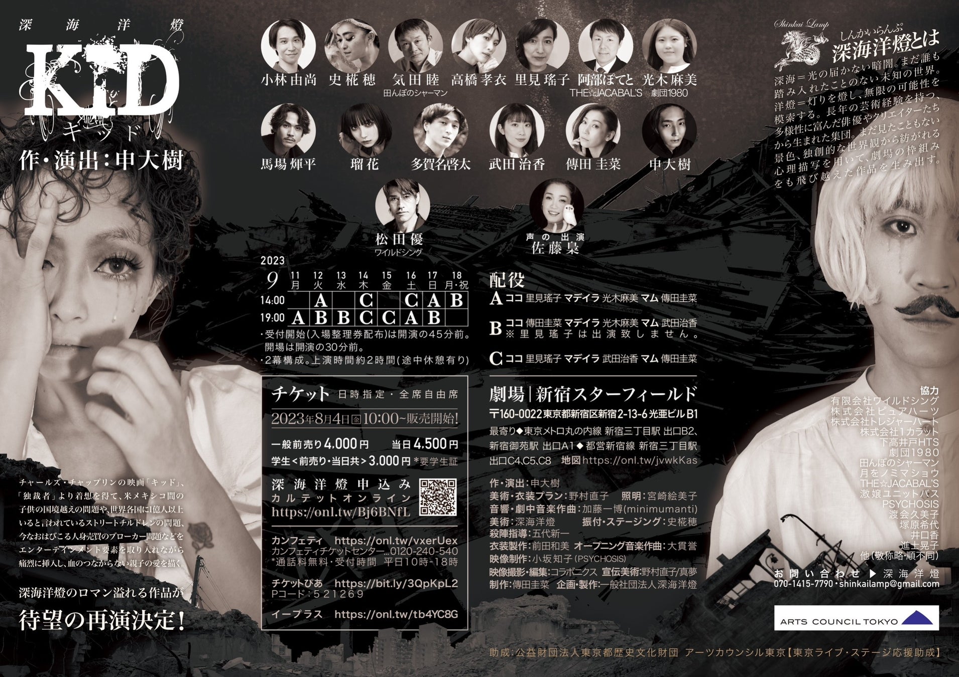 来春に予定されている深海洋燈の設立時からの目標である野外テント公演に向けて、更にブラッシュアップした『KID~キッド~』2023を是非ご覧ください。