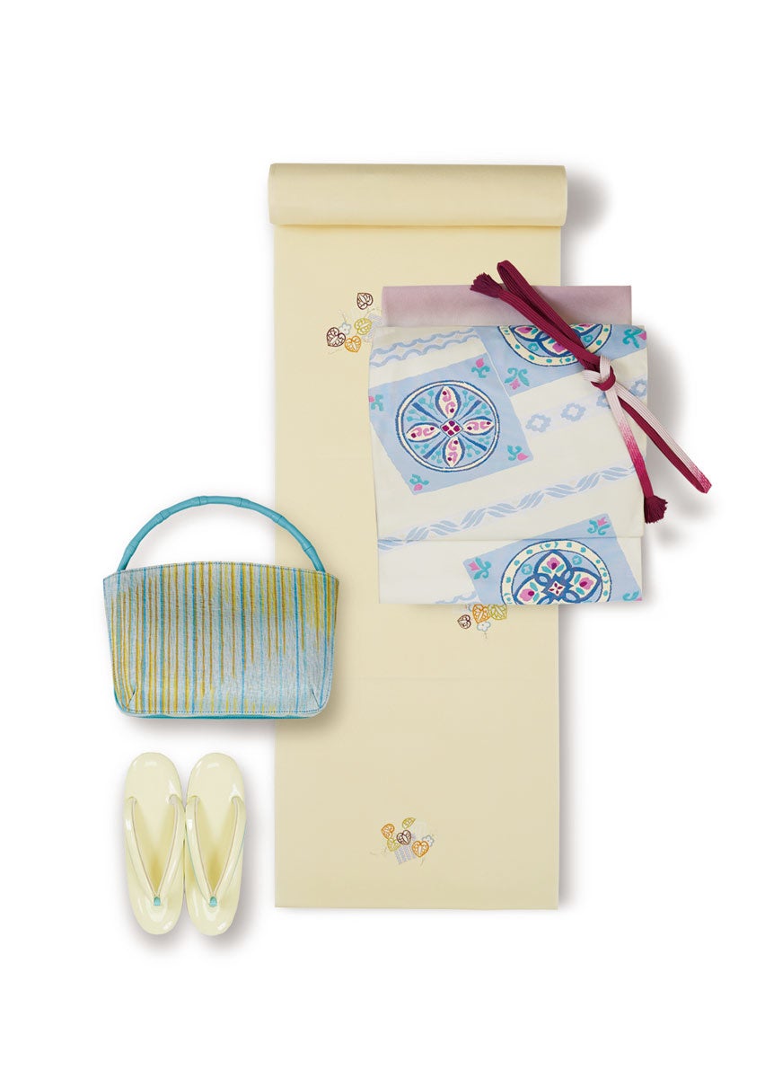 これから、茶道などのお稽古やきものを始めたい皆さまに。 淡い黄色のきものは、帯周りのコーディネートを楽しめるのが魅力です。 大人可愛い薔薇色の柔らかい色の帯揚げと臙脂の帯締めでメリハリを効かせてお楽しみください。