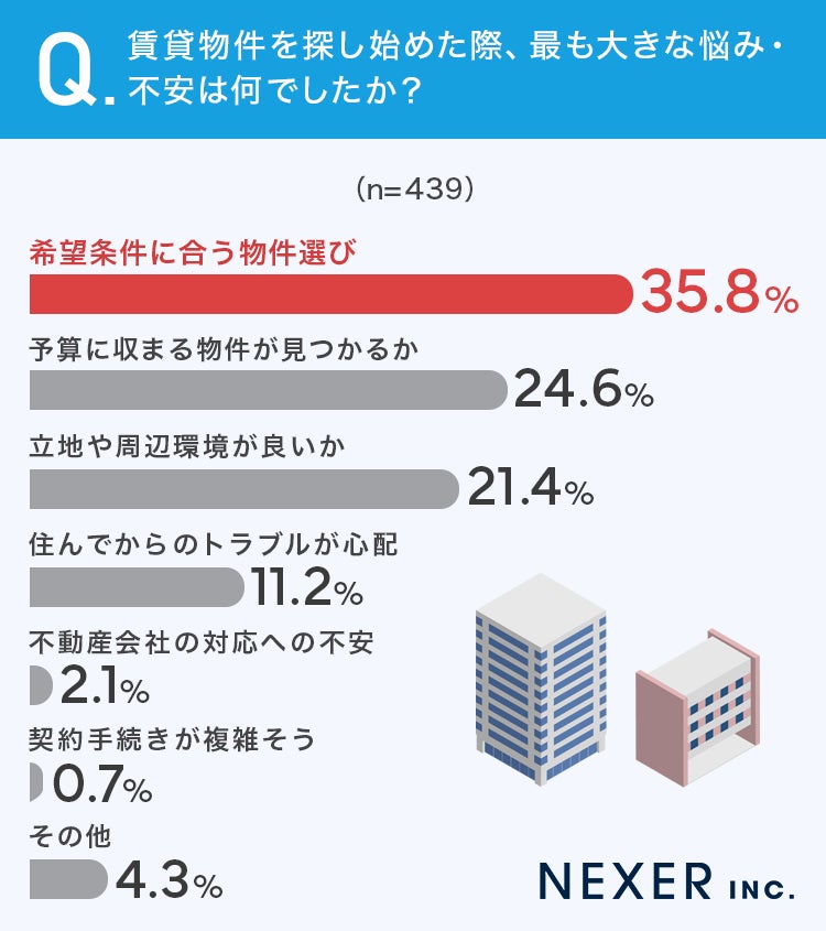 賃貸物件を探し始めた際、最も大きな悩み・不安は何かを調査した結果、35.8%が「希望条件に合う物件選び」と回答しました。
