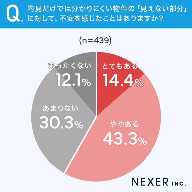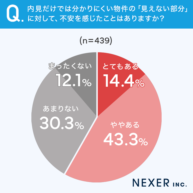 14.4%が「とてもある」、43.3%が「ややある」と回答し、半数以上が物件の「見えない部分」に対して不安を感じたことがあることが分かりました。