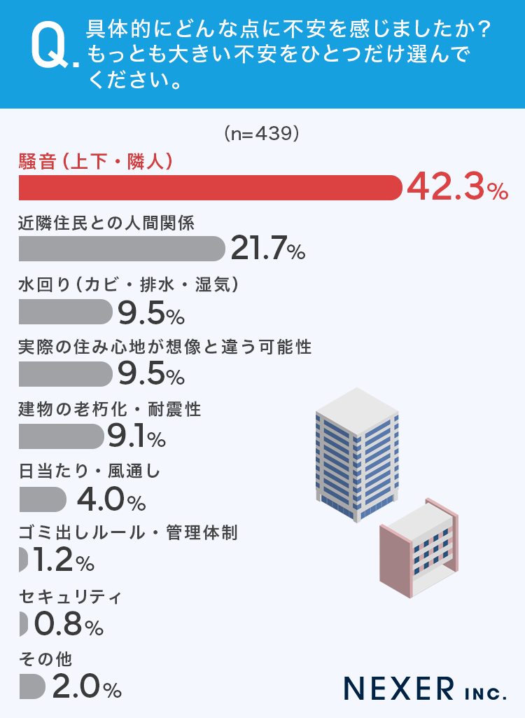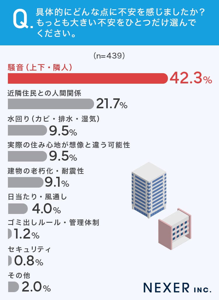 42.3%が「騒音(上下・隣人)」、21.7%が「近隣住民との人間関係」と回答しました。