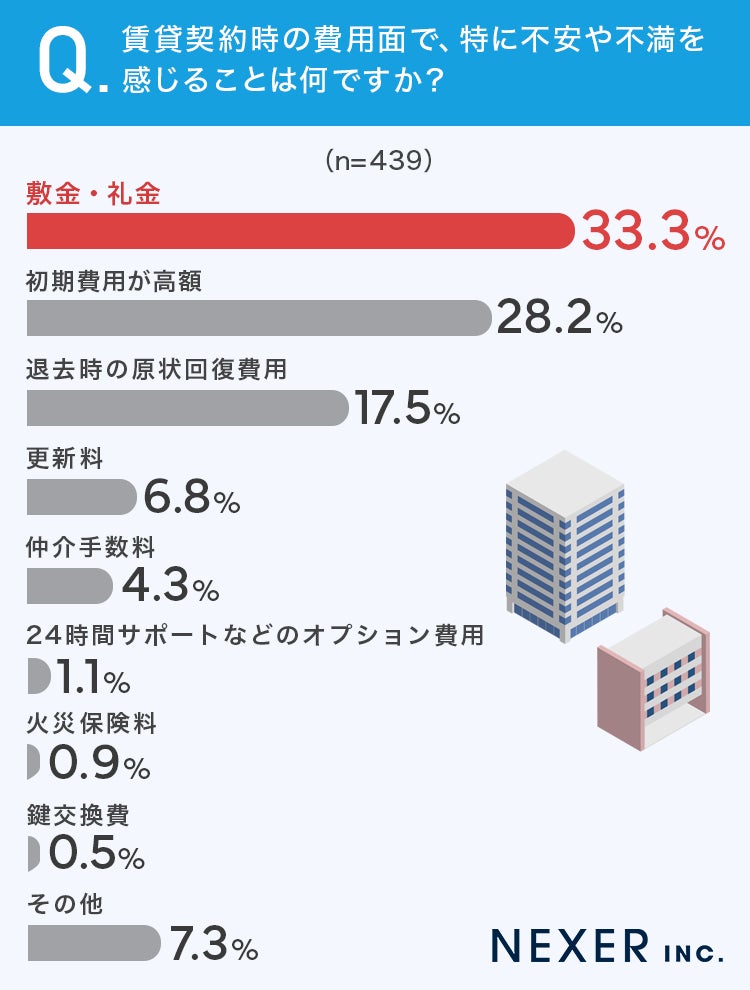 33.3%が「敷金・礼金」、28.2%が「初期費用が高額」、17.5%が「退去時の原状回復費用」と回答しました。