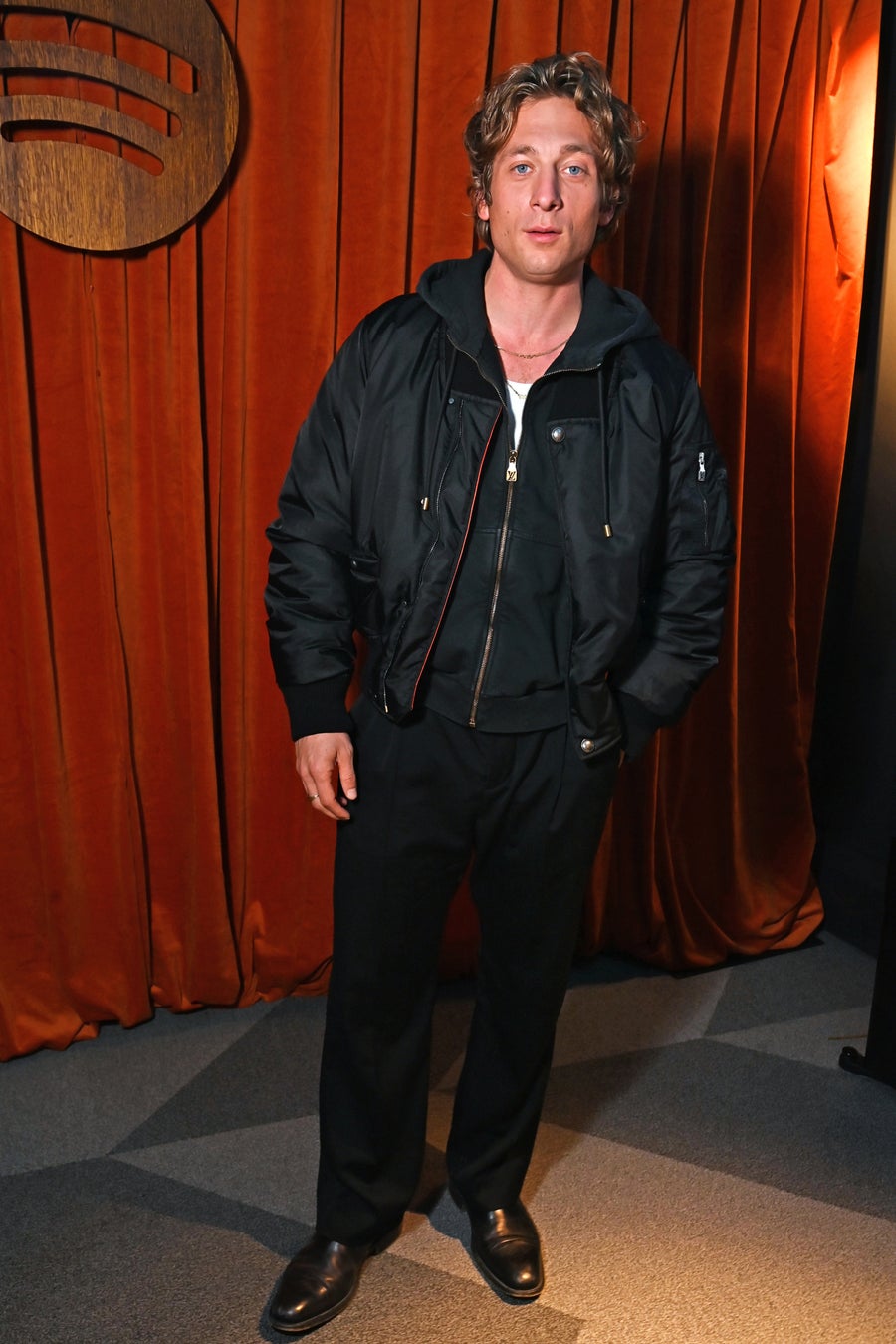 ジェレミー·アレン·ホワイトは、ブラックのナイロンボンバージャケットに、オーバーダイ加工が施されたブラックのフーディと、ホワイトのタンクトップ、ブラックのパンツ、ブラックのレザーブーツを合わせました。