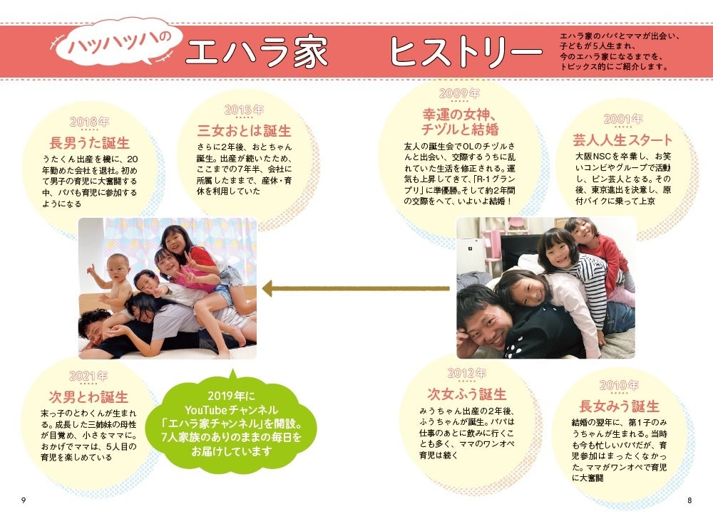本書では現在の7人家族のエハラさんの暮らしだけでなく、芸人エハラマサヒロがどうして誕生したのか? 幸運の女神チヅルさんとの出会いから、結婚までの話も包み隠さず大公開。本書を読めば、夫婦円満のヒケツも満載です。