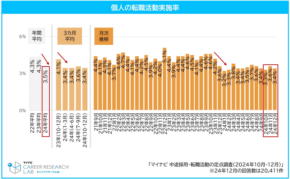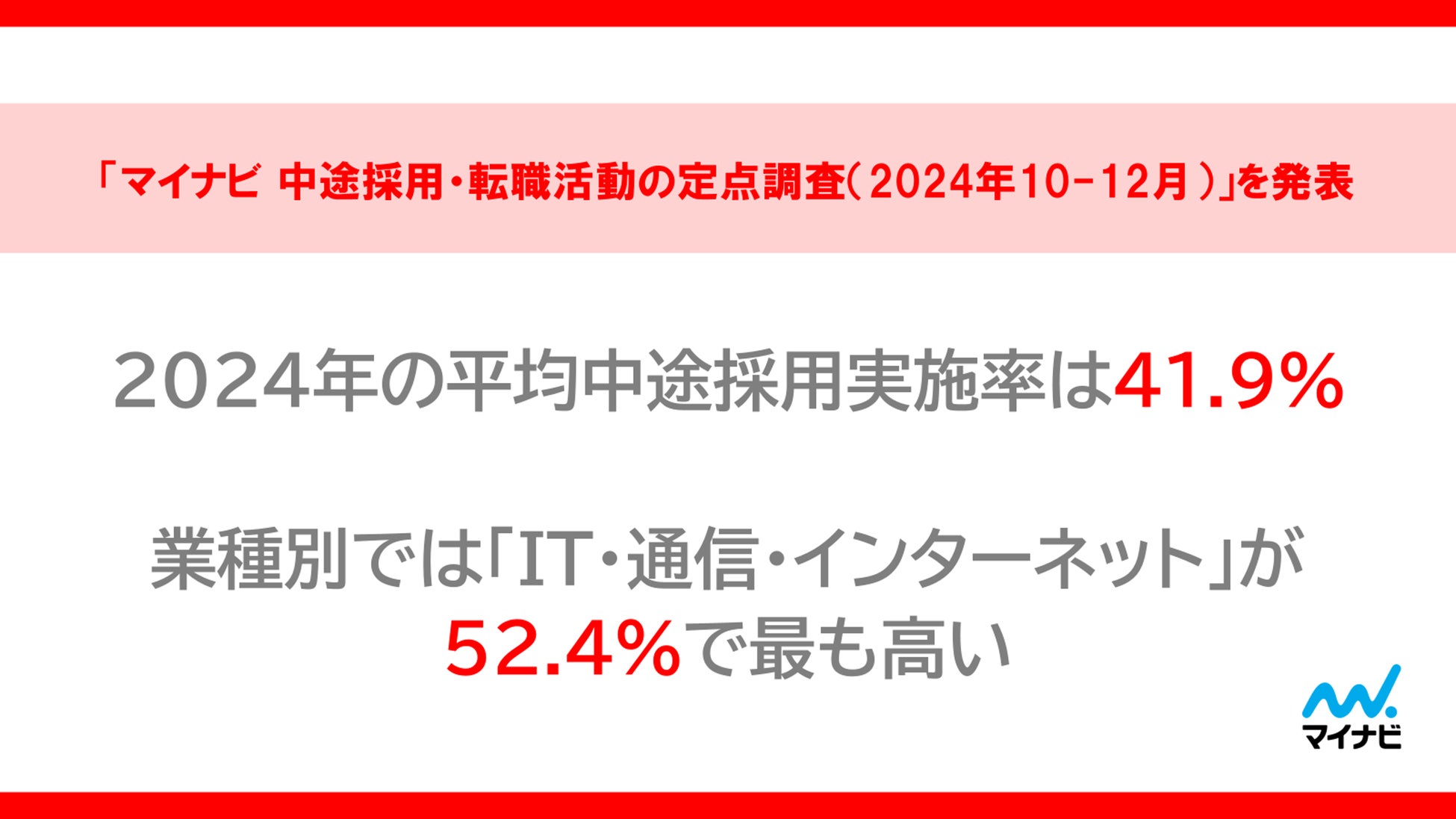 株式会社マイナビ(本社:東京都千代田区、代表取締役 社長執行役員:土屋芳明)は、全国の企業、個人を対象に実施した、「中途採用・転職活動の定点調査(2024年10月-12月)」の結果を発表しました。
