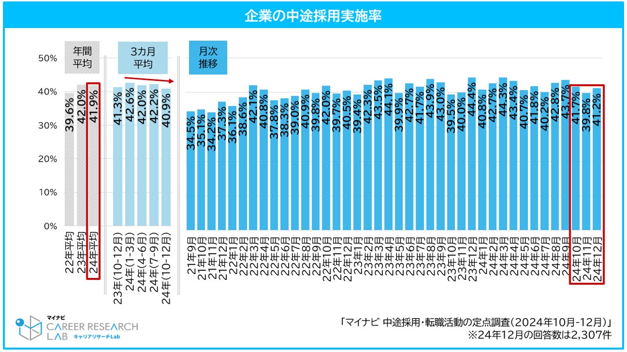 2024年12月の企業の中途採用実施率は41.2%で、2024年の年間平均は41.9%となった。直近1年間の中途採用実施率の推移をみると、3カ月平均の推移は減少傾向にある。【図1】