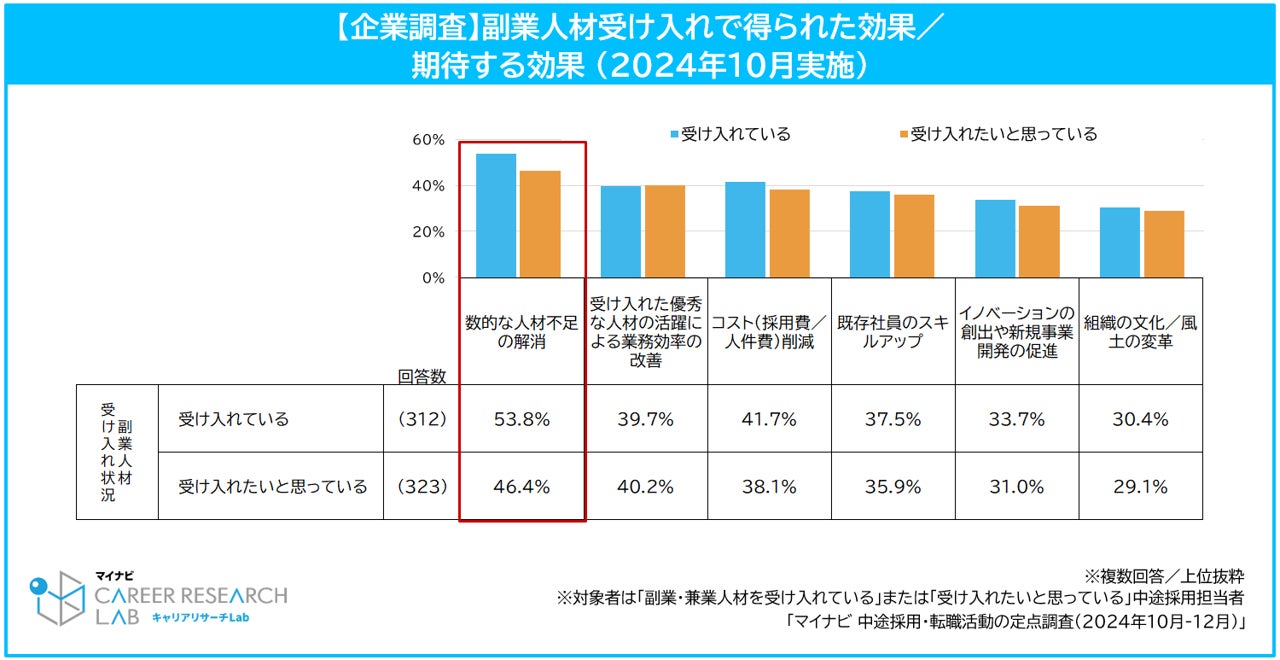 ◆副業人材受け入れ率は36.6%で、前年から2.1pt増加。受け入れで得られた効果トップは「数的な人材不足の解消」