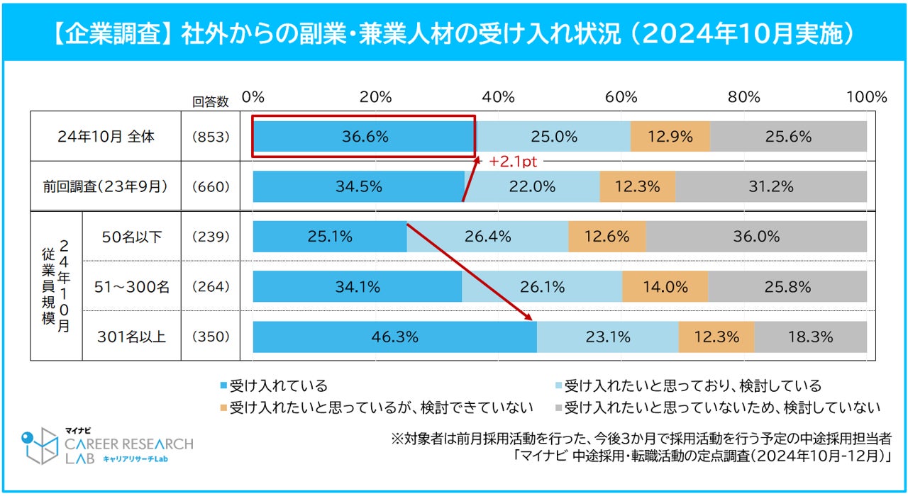 前月採用活動を行った・または今後3カ月で採用活動を行う予定の中途採用担当者に対して、副業人材を受け入れているかを聞くと、全体の36.6%が「受け入れている」と回答した。前回調査から「受け入れている」が2.1pt増加し、「受け入れたいと思っていないため、検討していない(25.6%)」が5pt以上減少していることから、企業側の副業人材受け入れが進んでいることがわかる。また、従業員規模が大きいほど副業人材の受け入れ率が高い傾向が見られた。【図6】