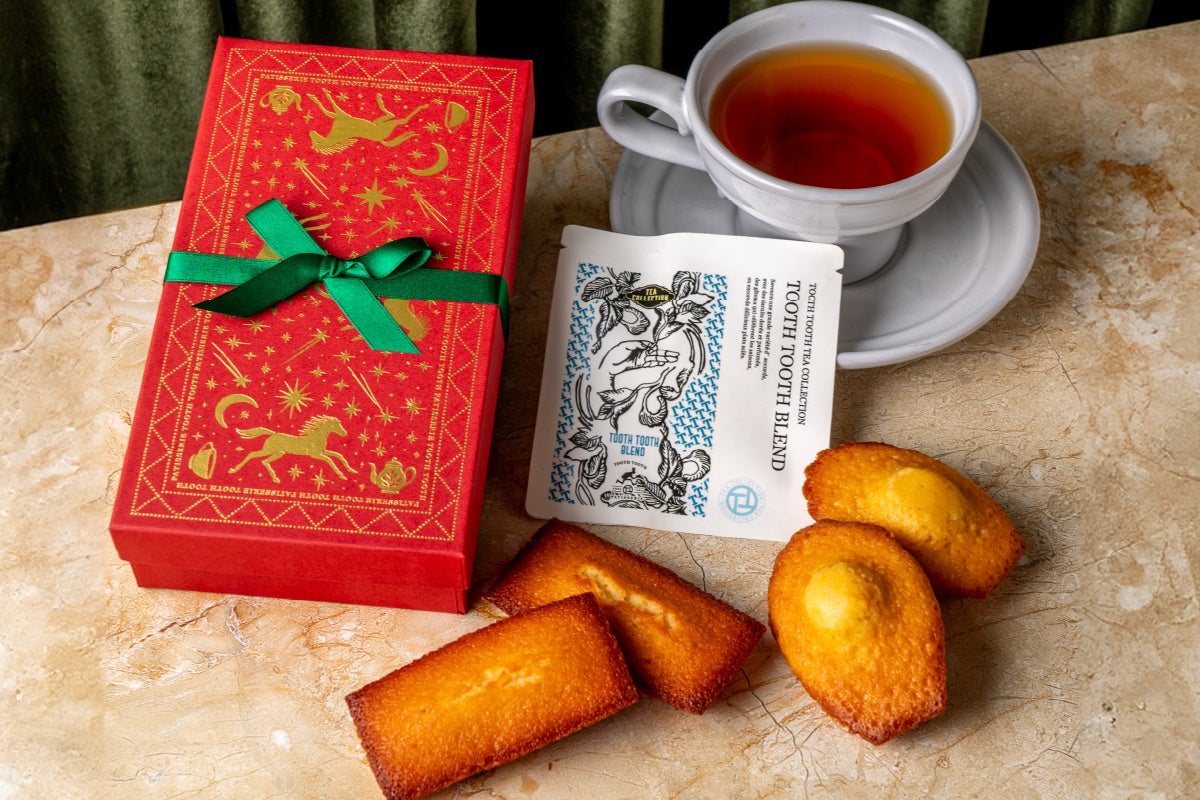 香ばしく焼き上げたフィナンシェとマドレーヌ、人気紅茶 TOOTH TOOTHブレンド を、季節限定のクリスマスカラーのギフトボックスでご用意しました。