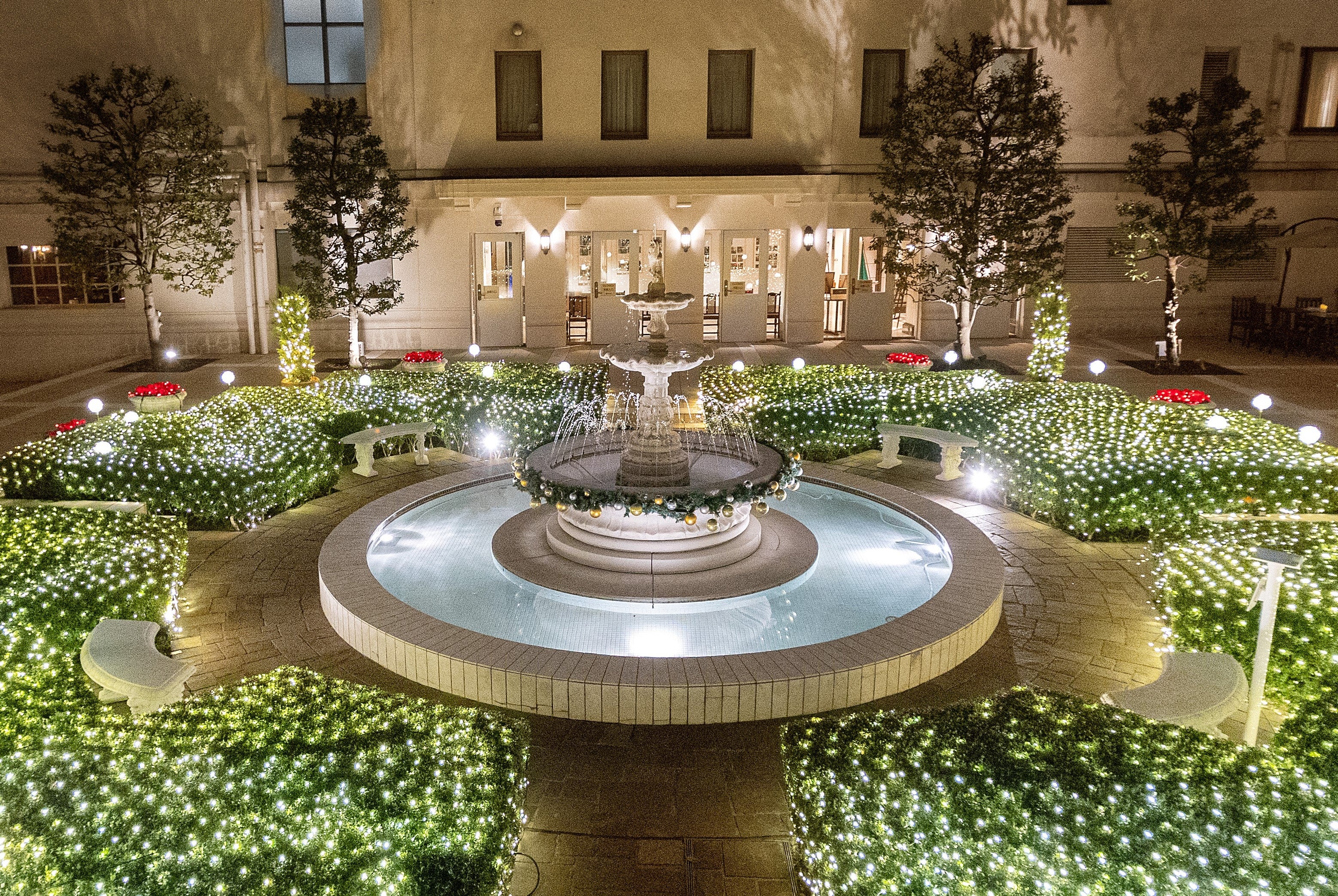 中央に噴水を配した緑あふれるヨーロッパ調の美しい庭園で、合計1.5万球の煌めくイルミネーションに包まれるロマンティックな空間をお楽しみいただけます。この時期ならではの、光や輝きに満ちた夢のような演出を、どうぞごゆっくりとお楽しみください。